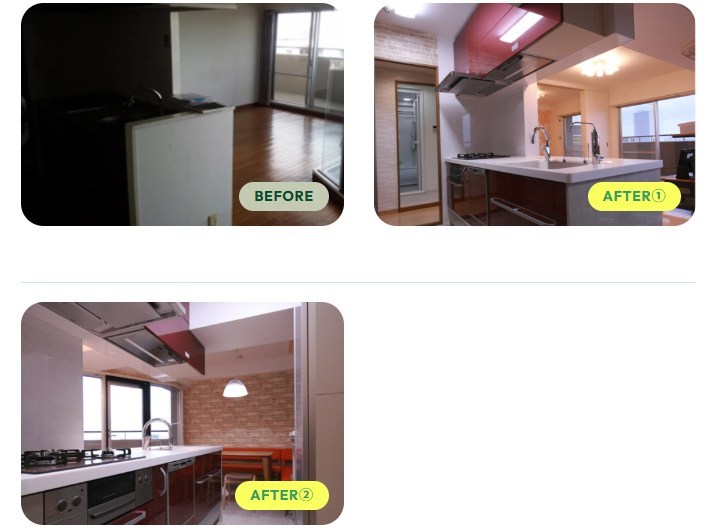 お客様の声: 「キッチンと壁紙を変えて、部屋全体が明るくなりました。リフォームすると、気分まで明るく変わるんですね!」