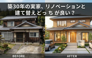 ご実家やご自宅が築30年を迎えるタイミングで、「そろそろ家全体に手を入れないと…」とお悩みの方は非常に多くいらっしゃいます。 思い出の詰まった住まいを残すリノベーションが良いのか、思い切って新しくする建て替えが良いのか、金額も大きいだけに迷ってしまいますよね。