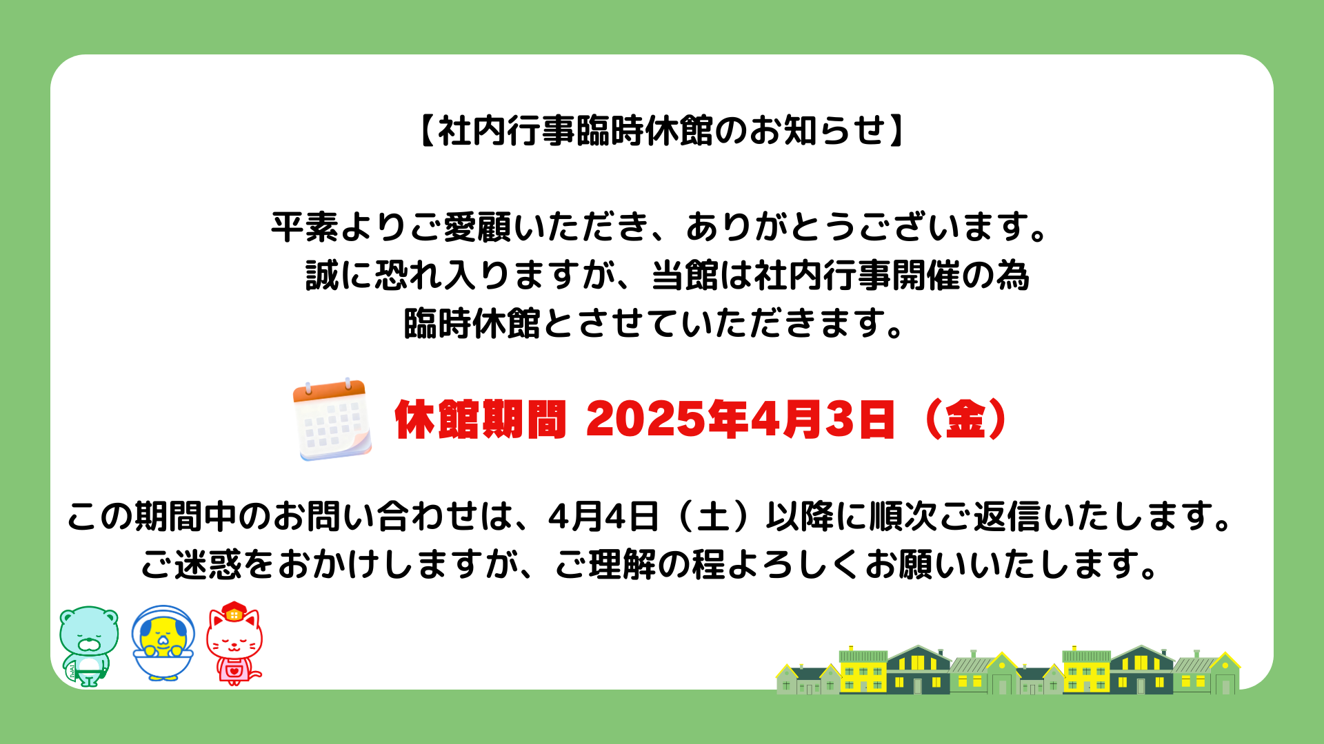 休館期間中にいただいたお問い合わせやメールにつきましては、4月4日(土)以降に順次ご返信させていただきます。お客様にはご不便をおかけいたしますが、何卒ご理解のほどよろしくお願い申し上げます。