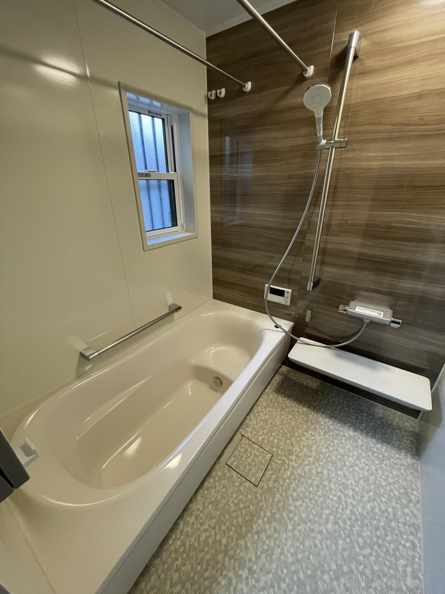 タイル調の浴室から、温かみのある木目調パネルが印象的なTOTOの「サザナ」へリフォームいたしました。 一番の魅力は、足元がヒヤッとせず柔らかい「ほっカラリ床」です。冬場の入浴も快適で、膝をついても痛くないため、毎日のお掃除もぐっと楽になります。また、ゆるリラ浴槽は身体を包み込むような形状で、節水しながらゆったりと疲れを癒せます。清潔感あふれる明るい空間に生まれ変わり、これから毎日のバスタイムが心安らぐ時間になれば嬉しく思います。