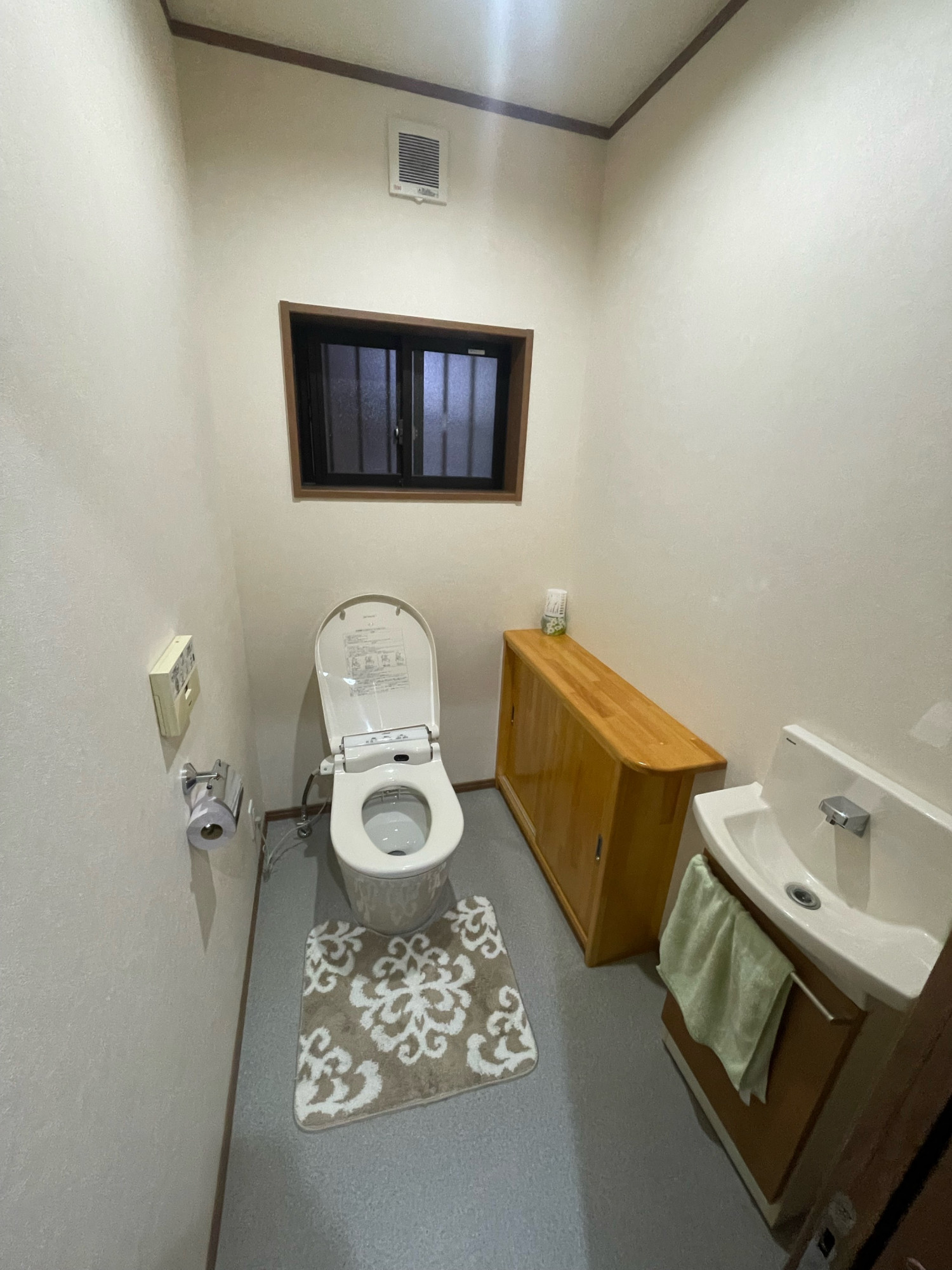 今回はTOTOの「GGA1」を設置いたしました。タンク式でありながら高さを抑えたローシルエットデザインが特徴で、空間をより広く、すっきりと見せてくれます。 機能面では、便器の表面に水の膜を作る「プレミスト」と、汚れが付きにくい「セフィオンテクト」陶器の相乗効果で、お掃除の負担を大幅に軽減します。また、渦を巻くような「トルネード洗浄」により、少ない水でも効率よくしっかり洗い流せる節水性能も備えています。手洗い器のある空間にも自然に馴染み、毎日の使い心地がぐっと向上しました。
