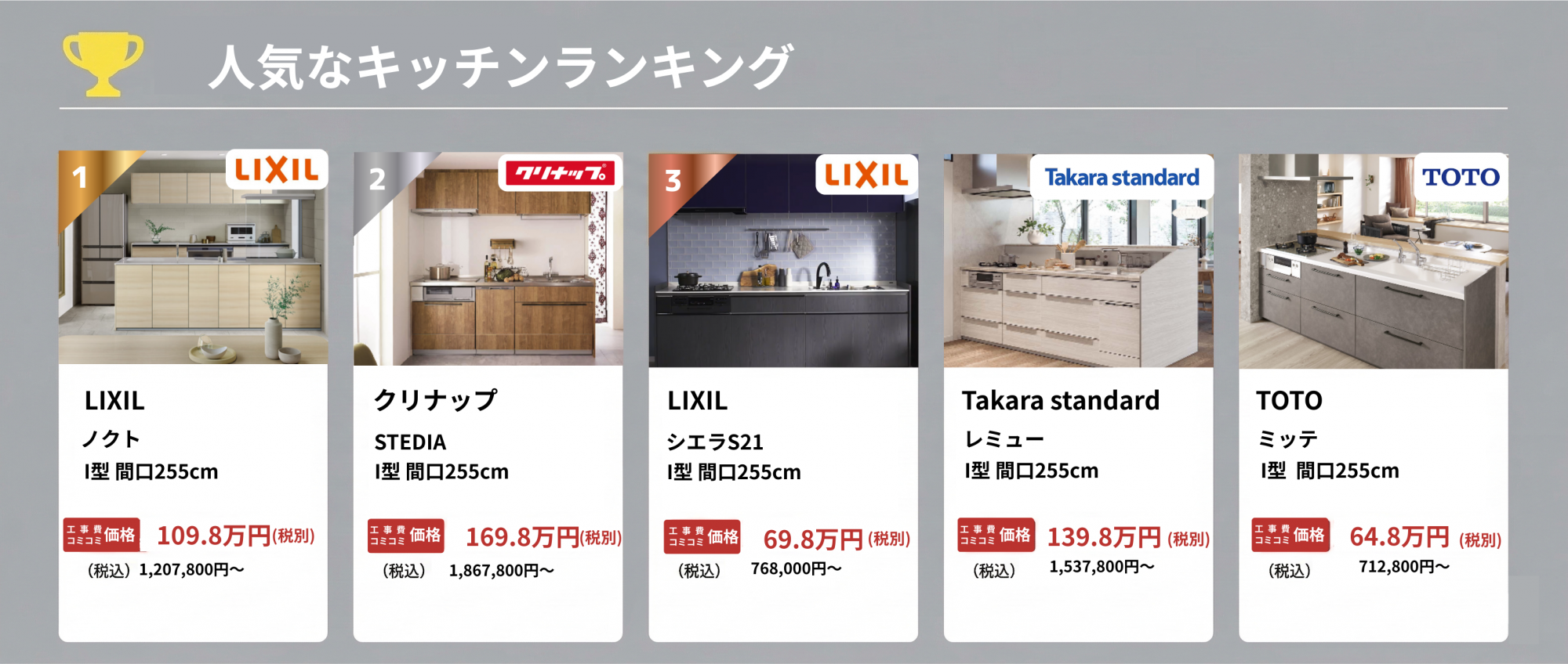 ご自宅に合ったレイアウトを一緒に考えていきましょう。お好みの色やレイアウトを選ぶことで、毎日使うキッチンを楽しい空間に。